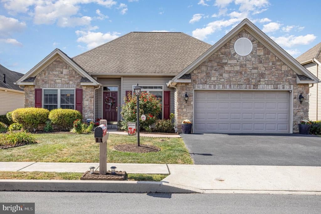 Experience luxury one-level living in this beautifully maintained ranch home, crafted by builder Max Marbain in the sought-after community of Winding Hills. Thoughtfully designed with quality construction and high-end finishes, this home offers an open layout featuring a soft neutral color palate, newer luxury vinyl plank flooring and a designer eat-in kitchen with 42” cabinetry, soft-close drawers, striking glass tile backsplash, under-cabinet lighting, GE Café appliances (including dual fuel oven and 5-burner gas stove), an oversized pantry, center island, a breakfast bar and adjoining casual dining space. The living room with vaulted ceiling showcases a tiled corner gas fireplace and opens via French doors to a 22x12 Nature Stone patio & fenced rear yard. Retreat to the primary suite featuring a vaulted tray ceiling, walk-in closet, and a luxurious en-suite bath with soaking tub, dual vanities, tiled floors, and a separate shower with grab bars. Two additional bedrooms share a beautiful full bath with porcelain tile floors, tub/shower with stunning custom tile surround & decorative accents. Additional highlights include custom window treatments, upgraded bronze hardware, main-floor laundry room with 39” cabinets and utility sink. Energy-efficient features: 2x6 construction, gas heat & manibloc plumbing system. Extended 2-car garage is finished & painted with recessed lighting, room for storage and a convenient attic access for additional storage space. Winding Hills offers a vibrant community lifestyle with integrated parks, walking trails, a heated saltwater pool, clubhouse, and fitness center. All this just minutes from major routes and shopping — offering unparalleled access to Central PA's top amenities. Pride of ownership is evident throughout — prepare to be impressed!